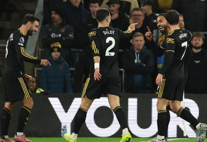 下半场易边再战。第51分钟,曼联再次进球!达洛特接到直塞球,前插获得单刀机会。他没有选择射门,而是冷静横传,姆伯莫包抄,轻松把球送进空门。第62分钟,曼联再次进球!布鲁诺-费尔南德斯送出妙传,芒特前插,单刀凌空射门,球进了!门将一点反应都没有。第80分钟,曼联获点球机会。布鲁诺-费尔南德斯主罚,他稳稳罚进,杀死比赛。最终,曼联4-1击败狼队。